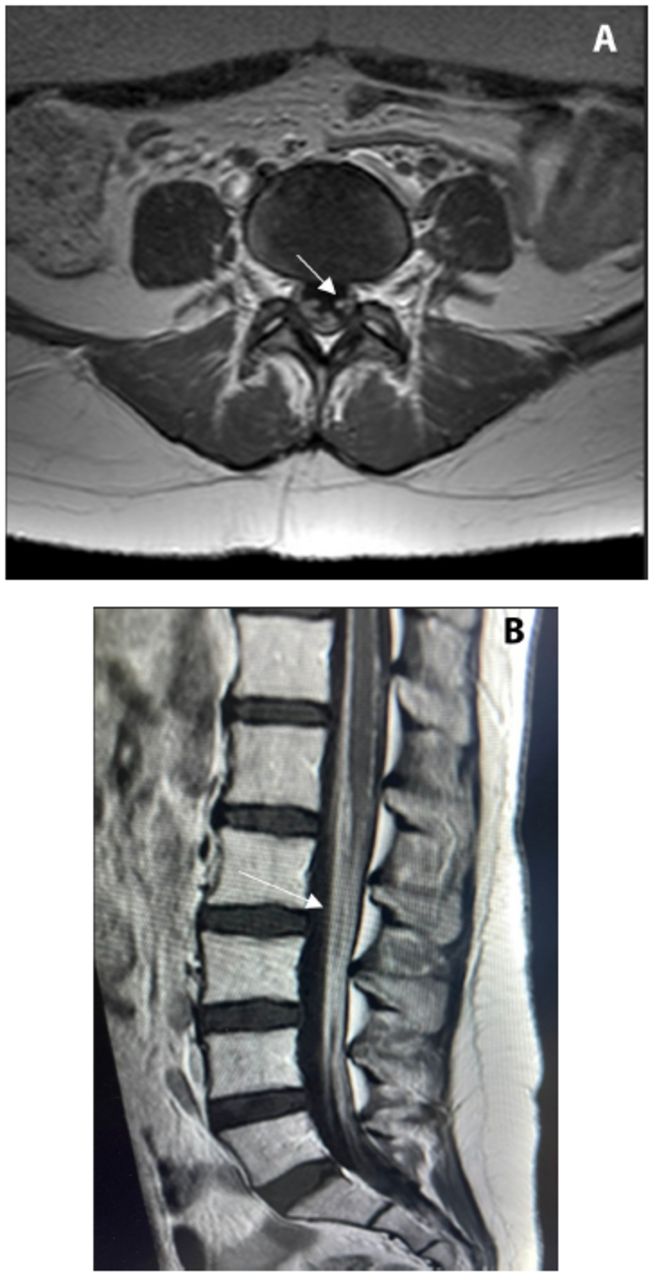 The patient was discharged with a referral to the physiotherapy department (2 sessions per week) and prescription of a home exercise program. At the 60-day physiotherapy follow-up, there was improvement in the patient’s back and abdominal muscles. By day 90, the patient started walking short distances, and by day 120, a dramatic positive change in the physical abilities was observed. However, the patient reported that difficulty in climbing stairs persisted.